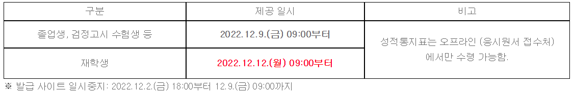 ㅇ 교부기간 : 2022년 12월 9일(금) ~ 2023년 1월 27일(금) 17시까지(기한 내 방문시 성적표 수령 가능)